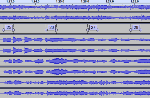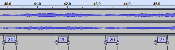 把原声底板放进音频编辑软件,就会看到很多时候它的节拍不明显,至少是看着不明显。于是我决定把它的节拍先找到。可惜试用了几个找节拍的工具,都不成功。自己写一个吧,看了看这个软件的源代码,感觉搞明白它的结构决定从哪里下手需要太多时间。于是只好凭耳听眼看,手工找节拍。我决定每个小节标前两拍,结果是这样的:
