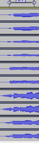 我们一共有4个K歌底板。一个是原声底板,另外3个是各个声部的钢琴底板。我求天边同学把这些底板也都下载下来。我把这些底板合成起来,看看它们之间齐不齐。结果不甚理想。有的地方不同声部之间相差一百多毫秒,更多的地方差四五十毫秒。有的同学觉得这已经很不错了,听着相当整齐。可是我觉得这一步不能马虎。