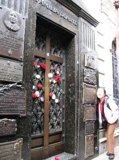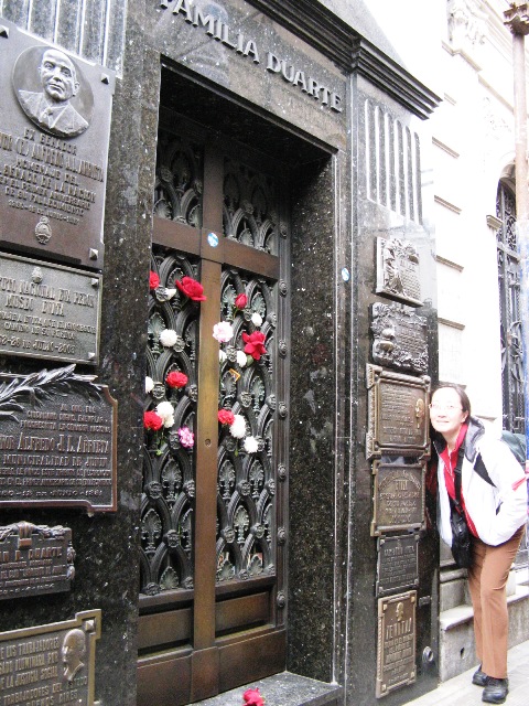 The cemetery at Recoleta, situated in the center of a bustling city, is on a boxed-in piece of prime real estate. Not only must one be rich or famous to get in, his/her family has to continuously pay up a city tax for him/her to remain there in peace. Right by the entrance, a tomb of a certain president receives occasional glances from passers-by, but no one seems to pause for a second. Inside, rows of tombs are like small houses one butting another, hosting the remains of politicians, generals, surgeons, and other dignitaries, and those of their family members. The cemetery appears desolate and tranquil, as it should be. A few fat cats call the place home, lazily dozing off in the cool winter sun. The only place that has significant foot traffic is off a side street, reachable only by those who followed a purposeful mental map. This is the resting place of Evita, among the family she had before she met her future husband and the future President of Argentina, Juan Peron. Her tomb is the only one with fresh flowers. In death as well as in life, Evita is loved by many.