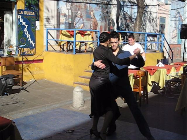 painted in bright contrasting colors. The streets beam with tango music