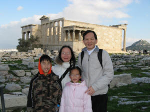 We also visited many other archeological sites in Athens, and the most impressive ones among these are the Ancient Agora (market place) and the Temple of Zeus. We learned that in the Ancient Agora, Socrates and Plato asked their questions, expounded and debated their ideas. It was here that democracy was first tested and the first human society based on reason and rationality was developed. It is no less great than the majestic Acropolis. There is an almost complete temple in the Ancient Agora, from the same time period as the Parthenon. Dedicated to Hephaestus, its main charm is its being a prototype of the Parthenon. Its Doric style columns are simple and unassuming. In contrast, the Temple of Zeus is mostly in ruins, and its Corinthian columns are more fanciful and extravagant than the Ionian ones used for the Erechthion. Having these three column styles in such close proximity gave us a deep impression of each. During the trip and afterwards, Yiran proudly labeled her own apple eating style "Corinthian" as she likes to bite the apple from all angles and leaves ornate marks.