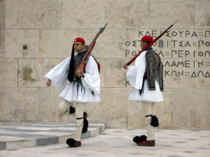 Other "mistakes" we made on this trip include having a meal on the (in)famous Kydathineon street in Plaka, where according to Lonely Planet "the food ... is generally ordinary and overpriced"; and thinking the guards in Syntagma Square were guarding their parliament building. Both were recognized after the fact, from reading the book we bought ahead of the trip. But from the readings before and after the trip, we are quite confident that we learned more about Greece than those in that guided tour group!
