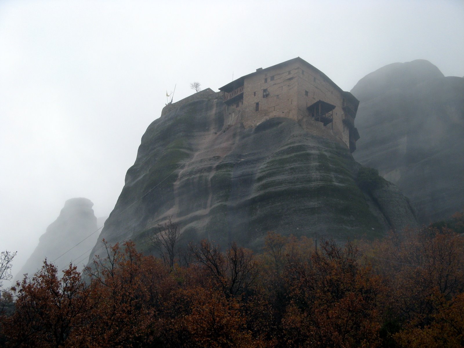 The Grand Meteora Monastery was the out-of-this-world home for a former emperor of Serbia, Symeon Uros, who brought his wealth (tax-deductible?) to the monastery. But that must be too long ago, as the monastery has by now not that much to show for the former wealth of an emperor, lacking the ostentation of Moni Ag. Rousanou. The monastery is quite large, though, having the good fortune of a bigger piece of rock to build upon. To reach the monastery, one has to climb up a flight of stairs, enter a doorway built into a seemingly solid piece of rock, walk along a gap behind a vertical piece of sheet rock (not the plasterboard kind, but the real thing), and go up the mountain more via several more flights of stairs. One novelty of this monastery is the ascension tower, with its mechanized pulley system pulling a net, for lifting the occasional orthodox monk who insists on it. One story about it goes like this: a guest asks the host whether the rope is ever replaced, and the host answers: "Of course! Whenever it breaks!" Another striking feature of this monastery is the ossuary, a room with shelves full of human skulls. Is Emperor Symeon Uros resting among them?