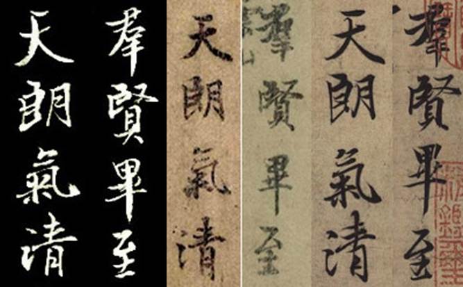 然则仔细观之,微毫比之,则思帖与原帖相去甚多。如上图,细节如“群”字之头重脚轻,“毕”字之长腿偏锋,“至”字之上松下紧,“朗”、“气”之挑勾,“清”字之出勾收笔等, 其书皆未得其法,与“神龙”、“天历”两帖有差矣。笼而统之,原帖险而奇,其书稳而雅。尝有友人云,临摹第一要像。不像则不妙。