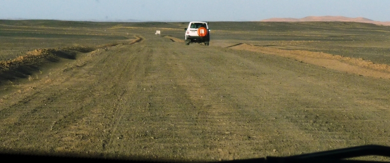 Jackson happened to turn his head and found in astonishment that an SUV was following us—in the desert that otherwise was devoid of signs of human activity in all directions. Oh, no, it was trying to overtake us, as it was driving off of this piste. We slowed down, trying to make it easier for the SUV to pass. But, it didn’t overtake us. Instead, the driver looked at us directly in the eye and made urgent hand gestures. Mindful of the hard-(ly) working AC in the car, Jackson rolled down his window reluctantly. The driver poked his head out of his window. It’s a middle aged man, fair skinned, slightly bald, in a faded blue Arab robe. He spoke, clearly and commandingly, in English: “Are you Agnes?”