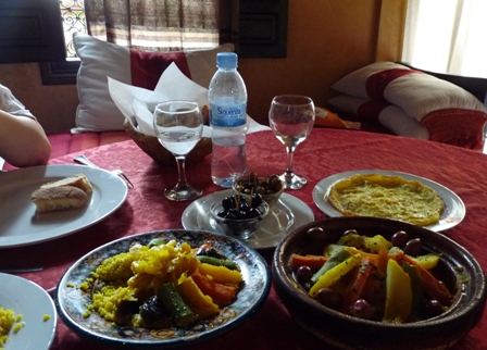 On the top floor of the hotel is a restaurant, where the food is about twice as expensive as on the square, but one gets to enjoy the AC from a wall unit. The menu is in French and English, and every dish seems to contain some words alien to us. Jackson was happy to introduce couscous to the family, which he had tried before and was certain that the family would enjoy. On the advice of the restaurant owner, who was reading a newspaper in the restaurant and could speak English, we ordered a tagine and a dish of meatballs. The tagine, a completely new type of dish to us, turned out wonderfully delicious. The meatballs, while sounding and looking familiar, tasted foreign and uninteresting.