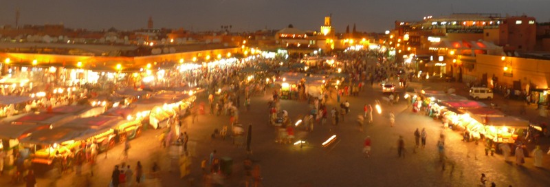 The center of Marrakech Medina is Jemaa el Fna, a large square. During the day it is an open-air market. You see orange juice stands (many of them lined up in neat rows), small vending areas selling trinkets, hats or other local crafts, and performers of all kinds, making monotonous but loud noises that excite the air (they are meant to be music, but the open-air mixing of these sounds produced a sensation that was not entirely musical or joyful). We took a couple of pictures of snake charmers, and paid 10 DH for the privilege. In the evening most of the square is quickly converted into a food court. Aromas of grease and spices spread with smoke and hot air, blown about by the warm breeze that changes direction capriciously. There are several mosques on the periphery of the square, but we infidels could not enter, and had to contend with taking pictures of the minarets from a distance.