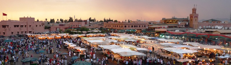 Our minivan stopped at the entrance of a small alley, and we were told to take our luggage and walk the rest of the way. In a couple of minutes, we were at our hotel, Jnane Mogador. And the place where the minivan was parked was in fact the most famous square/open-air-market in Morocco, Jemaa el Fna. (The spelling of names in English is not standardized, as English is neither a native language, nor an official one, which are Arabic and French, respectively.)