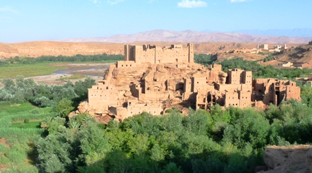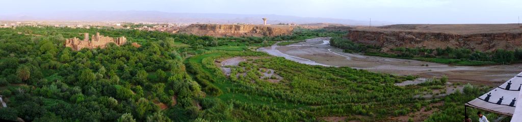 By evening time we arrived at El Kelaâ, and we made one more call at the intersection in the center of the town. Again Agnes first talked to someone in French, and then with someone else in English, without gaining the knowledge as to where we were to go. But hearing that we were parked under the Western Union sign, the person on the other end of the phone call offered to come over and get us. In about ten minutes, we made eye contact with someone driving a green truck, followed him out of town, and parked on top of a precipice. Down below, the failing light of dusk glimmered over a small creek in a broad and green valley, where two apparent dilapidated earthen castles testify the passage of time and the glorious days of a bygone era.