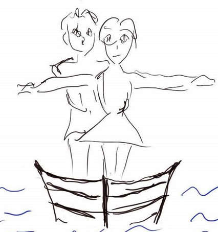 好在,你们俩以自由落体的速度坐下来的时候,小船不再感到你们俩的重力,开始恢复平衡。