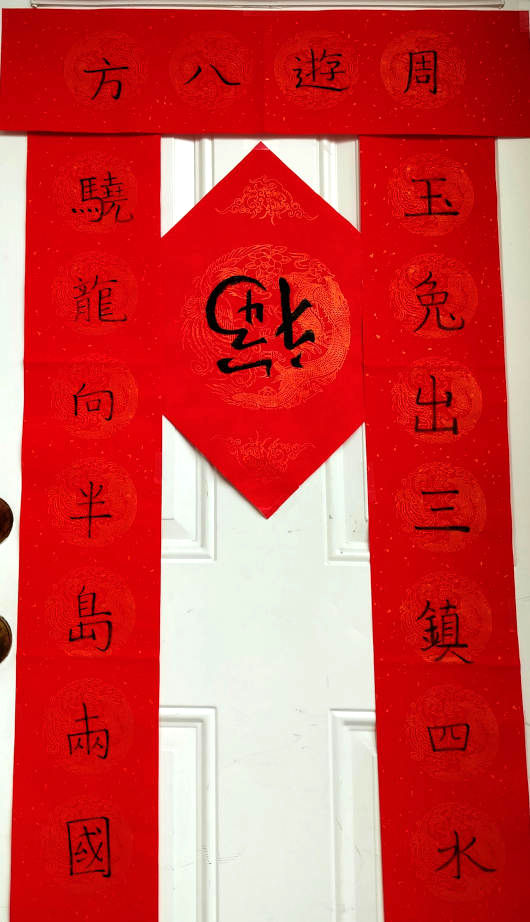In the last few years, my daughter, having learned to do Chinese calligraphy using a brush pen, have been asking me to come up with couplets for her to write and hang up on her door. According to tradition, a couplet is two sentences or phrases that are neatly created to match each other in sentence structure, mirror each other in meter, and complement each other in meaning. A short phrase is also written to give a title or summary to the phrase, and then the whole set is hung up on the door. The characters used are often the traditional ones, instead of the simplified version that she learned to read and write from childhood. For the New Year’s couplets, the content is generally about the prospect for the new year, and the retrospect of the old year. When I was growing up, the tradition of writing and hanging up New Year’s couplets was mostly abandoned in China, but now it is practiced again.