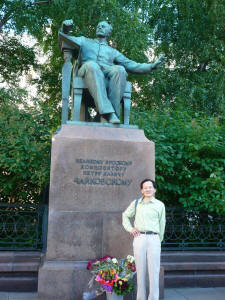 English and was able to direct us to the front of it, on the street we came from. I recognized the statute of Tchaikovsky, as it was
